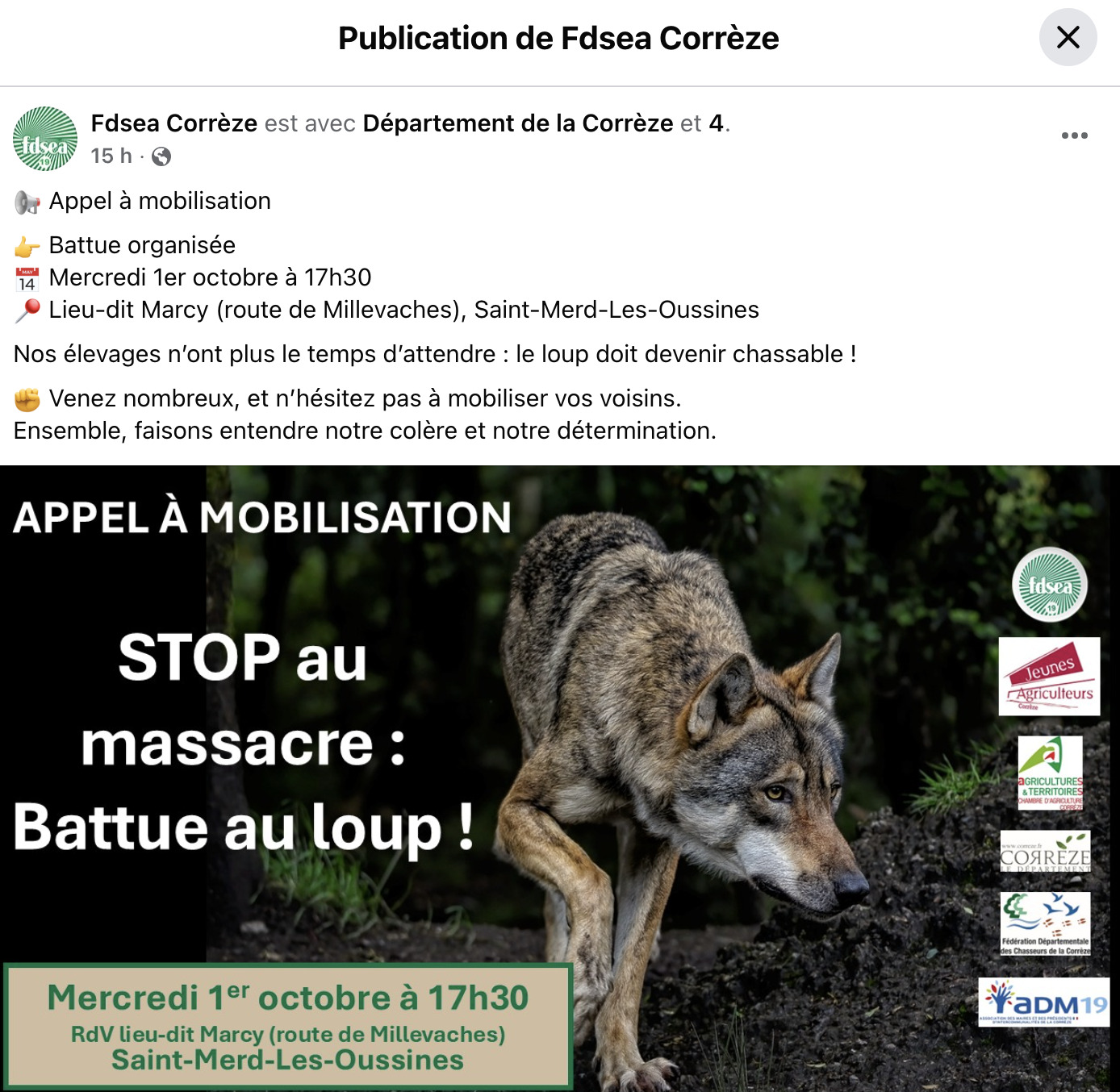 La FDSEA Corrèze et plusieurs organisations annoncent publiquement la tenue d’une « battue aux loups » en Corrèze ce mercredi 1er octobre. Une provocation grave et une violation directe du droit : les loups étant protégés, les tuer est une infraction sévèrement sanctionnée.